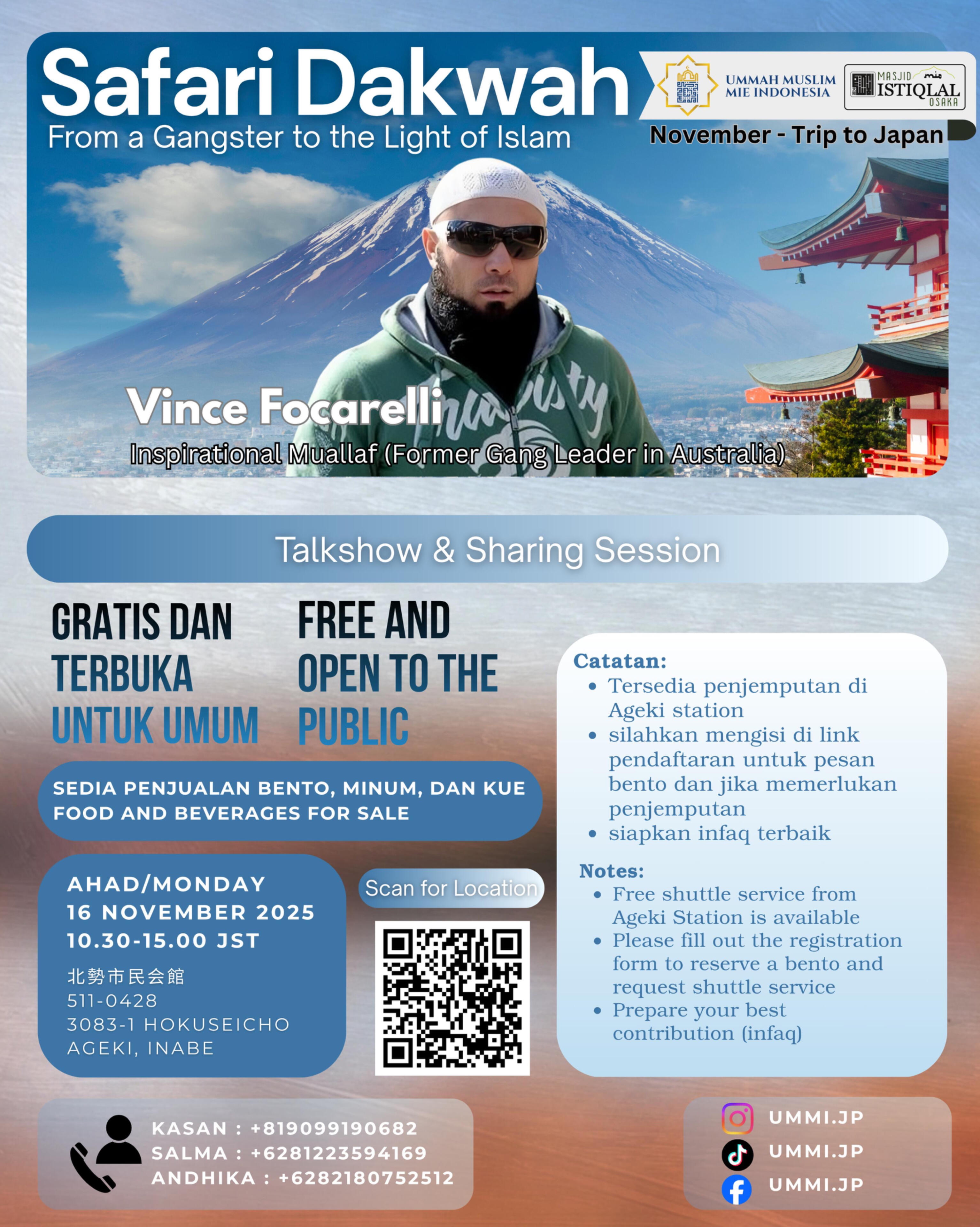 Mari bergabung dalam Kegiatan Silaturahmi Bulanan UMMI, yang menjadi pilar penting bagi kehidupan sosial dan spiritual komunitas Muslim Indonesia serta umat Muslim dari berbagai latar belakang di Prefektur Mie. Kegiatan ini diadakan setiap bulan sebagai wadah untuk memperkuat iman melalui kajian Islam, melaksanakan shalat berjamaah, dan mempererat ukhuwah serta silaturahmi di antara sesama.Selain memperkaya ruhiyah, kegiatan ini juga menjadi ajang untuk saling berbagi informasi dan pengalaman tentang kehidupan di Jepang, memperluas jaringan, serta memperkokoh kebersamaan.Insya Allah, melalui kebersamaan ini, kita dapat terus menjaga semangat, saling mendukung, dan memperkuat fondasi umat di tanah perantauan.